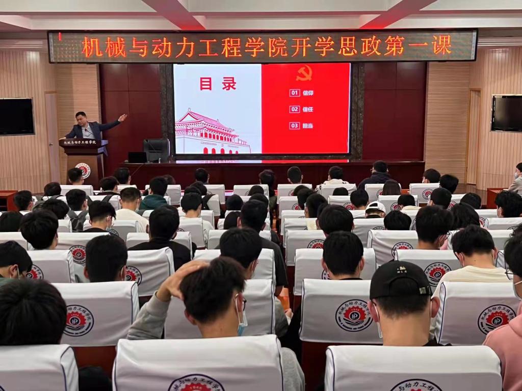 3月15日下午,党委书记聂凯在学院205会议室以“深入学习贯彻党的十九届六中全会精神—坚定理想信念、牢记初心使命”为题为全体学生党员代表、学生干部代表讲授开学第一课。