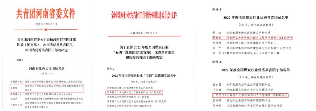 机制2003班王世钰被授予“河南省优秀共青团员”、机电19-2班团支部被授予“全国煤炭行业五四红旗团支部”、能动1904班贾鹏辉被授予“全国煤炭行业优秀共青团员”、院团委副书记王思思被授予“全国煤炭行业优秀共青团干部”,年度所获五四表彰数量创我院新高。