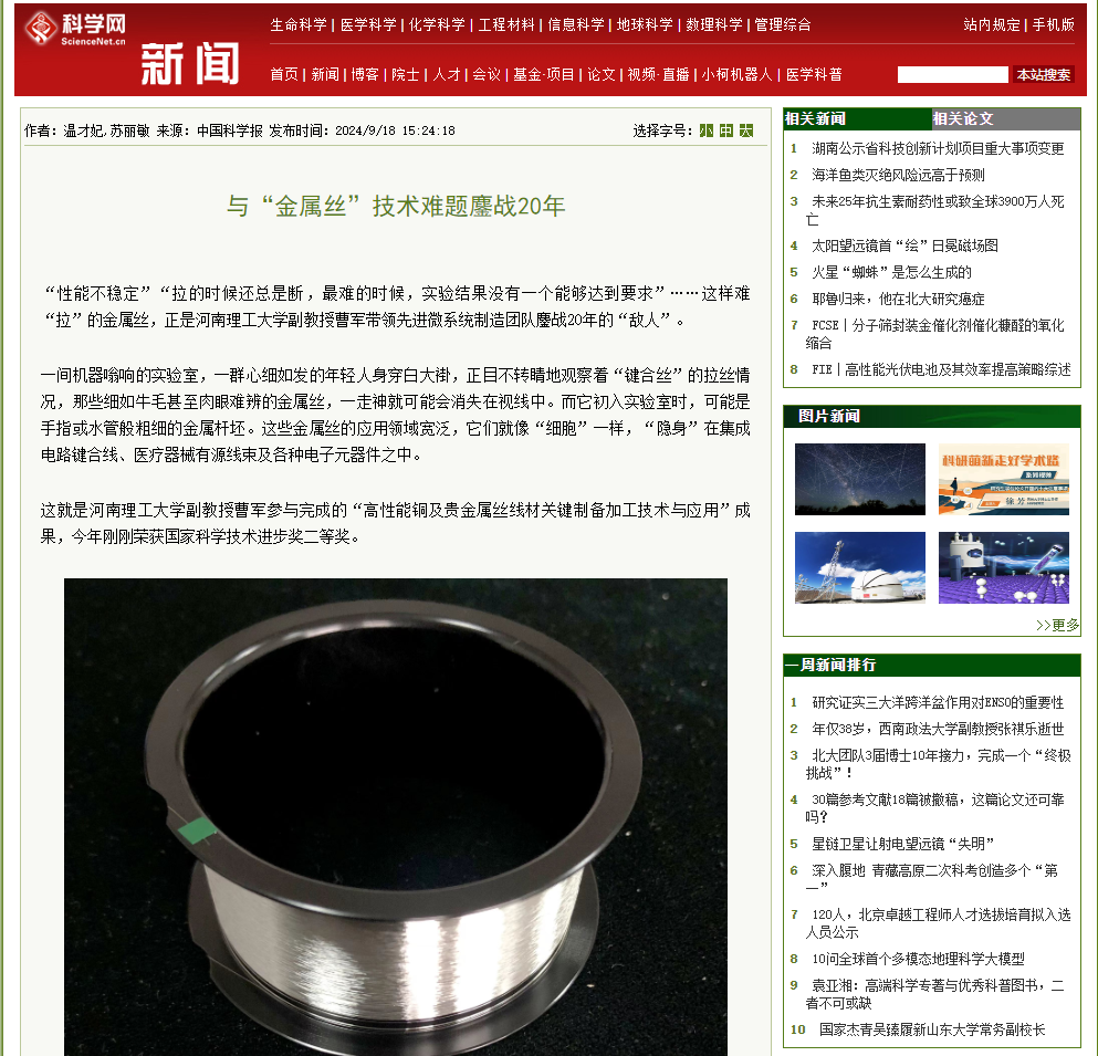 这就是河南理工大学副教授曹军参与完成的“高性能铜及贵金属丝线材关键制备加工技术与应用”成果,今年刚刚荣获国家科学技术进步奖二等奖。