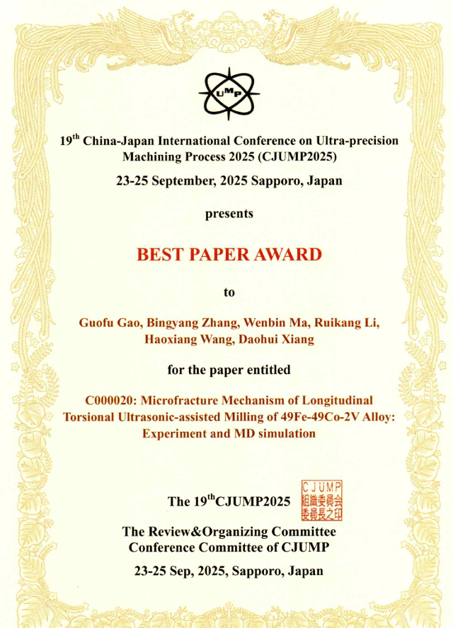 第19届中日超精密加工国际会议(The 19th China-Japan International Conference on Ultra-Precision Machining Process, CJUMP 2025)于2025年9月23日至9月25日在日本北海道札幌市举行。本次会议涵盖精密测量、微纳加工、仪器计量等工艺技术的新发展。我院高国富教授及其精密加工技术与装备团队成员受邀参会,并获得大会的“最佳论文奖”。