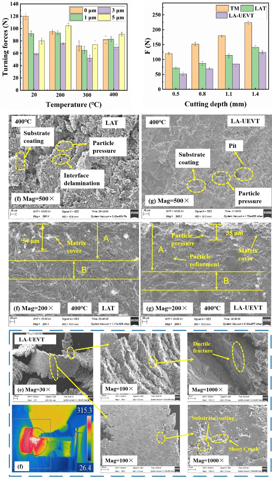 3)针对高体积分数的SiCp/Al复合材料加工效率低、加工表面质量不高等难题,向道辉教授团队提出了一种激光辅助超声椭圆振动加工技术(LA-UEVT)对70% SiCp/Al进行车削试验研究,结果表明,相对于传统加工(TM)和激光辅助加工(LAT),LA-UEVT有效降低了切削力和表面粗糙度,提高了塑性去除能力,并有效抑制了表面损伤和亚表面损伤。该研究为高强度复合材料的加工提供了一种可行的方法。