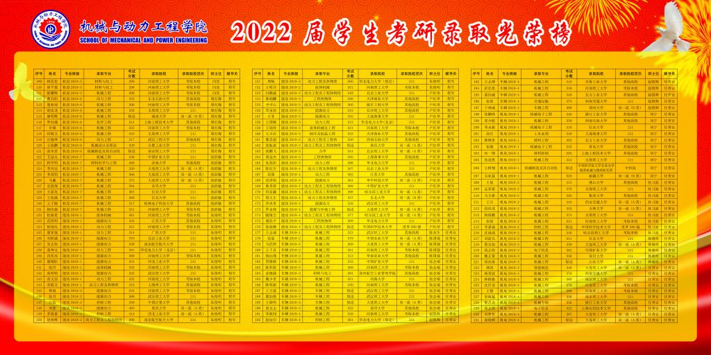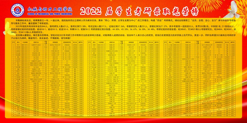 2022年我院共有本科毕业生844人,报考研生人数621人,报考比例73.58%,考试过线人数317人,过线比例37.56%,考取研究生人数231人,录取比例为27.37%。其中考取双一流院校53人,世界200强2名,中科院1名,211院校60人。考研录取比较好的班级是:能动18-1、能动18-3、机设18-4、车辆18-3、机制18-2,考研录取比例分别是:44.83%、43.33%、36.67%、36.00%、34.48%;考研比较好的宿舍是:松2#542、竹3#521有5人考取研究生,松2#404、松2#341、松2#405、竹3#112有4人考取研究生。