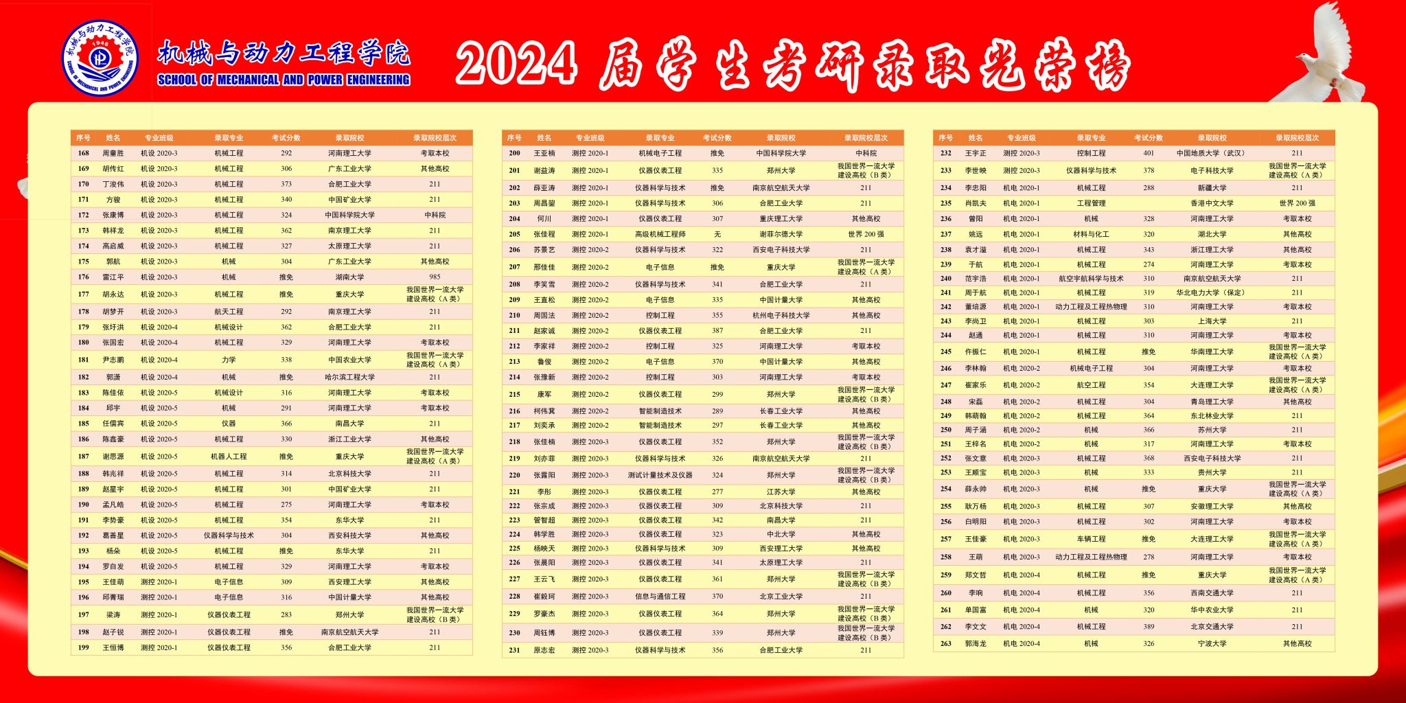2024年我院共有本科毕业生774人,报考研究生人数575人,报考比例74.3%,考试过线人数297人,过线比例38.37%,考取研究生人数263人,录取比例为33.98%。其中考取世界200强院校2人,考取我国世界一流大学建设高校(A类)40人,考取985院校4人,考取我国世界一流大学建设高校(B类)11人,考取211人数86人,考取中科院和社科院3人,实现了录取率高、质量高的“双高”佳绩!考研录取比较好的班级是:测控20-3、机制20-4、机制20-5、能动20-4、能动20-1,考研录取比例分别是:55.17%、51.72%、51.72%、51.72%、51.61%;这优异成绩的取得,既是考研学子孜孜不倦、不懈奋斗的硕果,也是学院不断提高教学质量、坚持不懈培养高质量人才的重要体现。