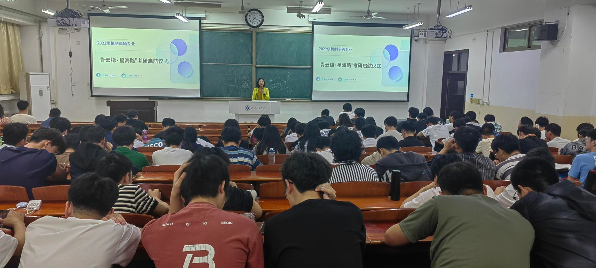 (本网讯 王瑞瑞 王文韬)4月24日晚,我院2022级机制车辆专业在三号教学楼以专业为单位举行“青云梯,星海路”考研启航仪式。两个专业300多名学生在辅导员老师的带领下,通过数据解读、政策研判、经验分享等环节,为备战2026年研究生考试绘制科学备考路线图。
