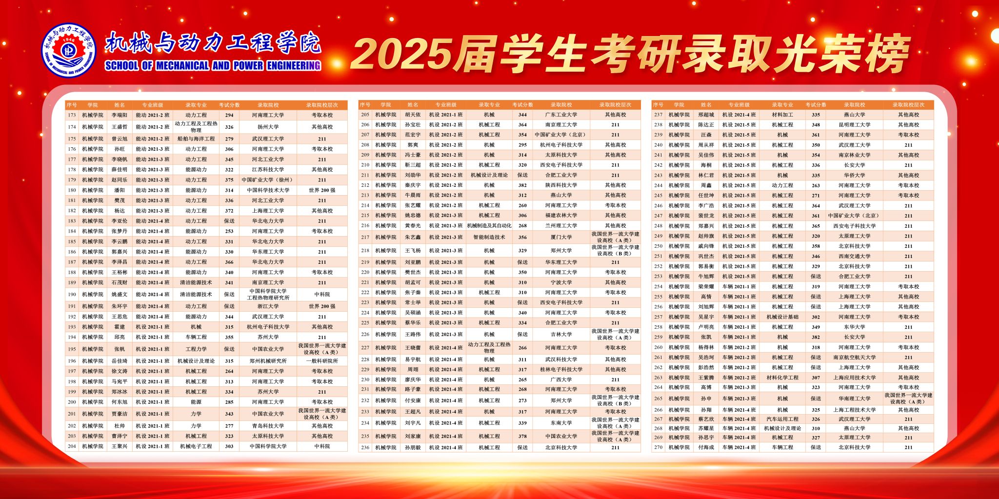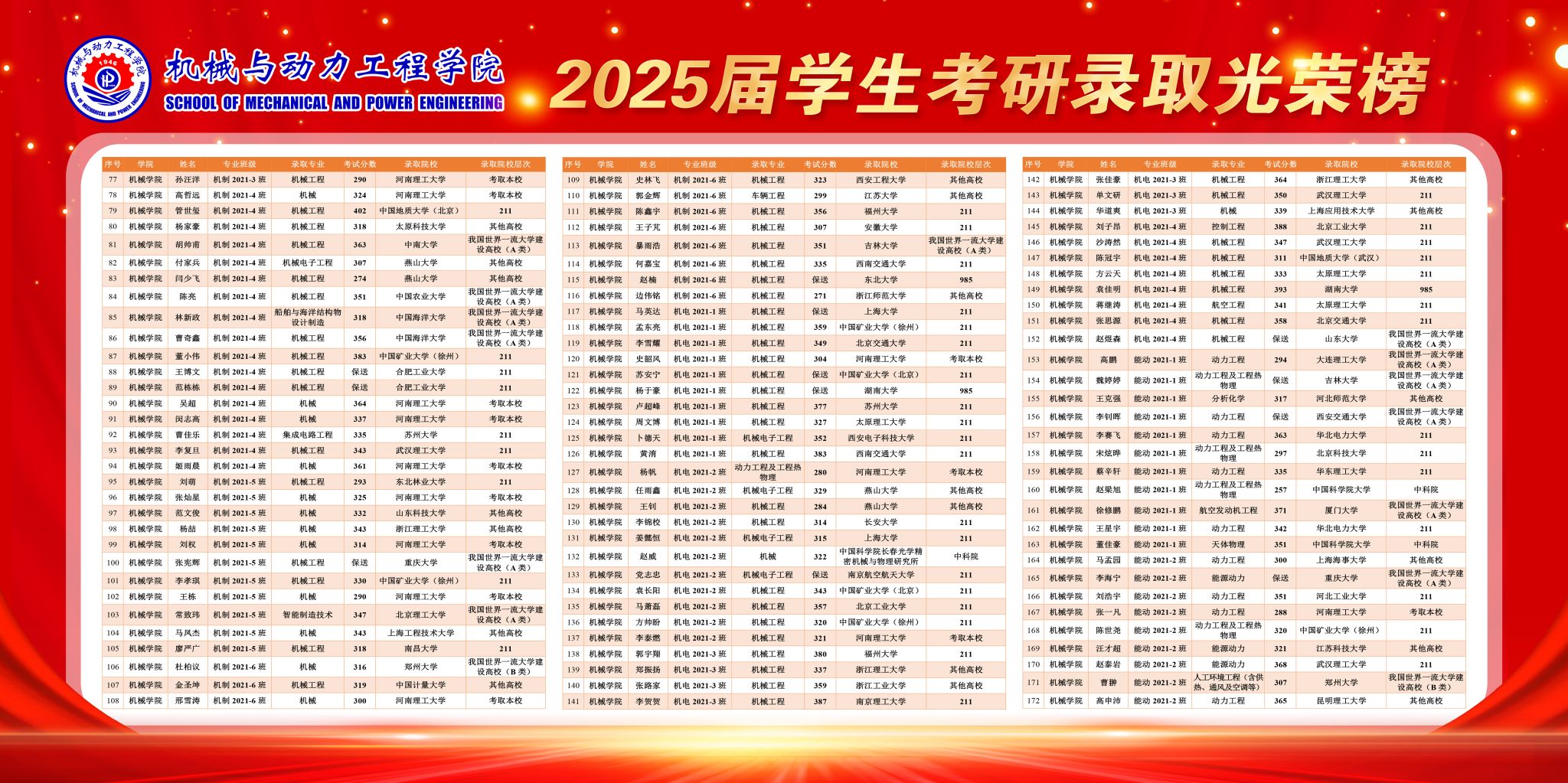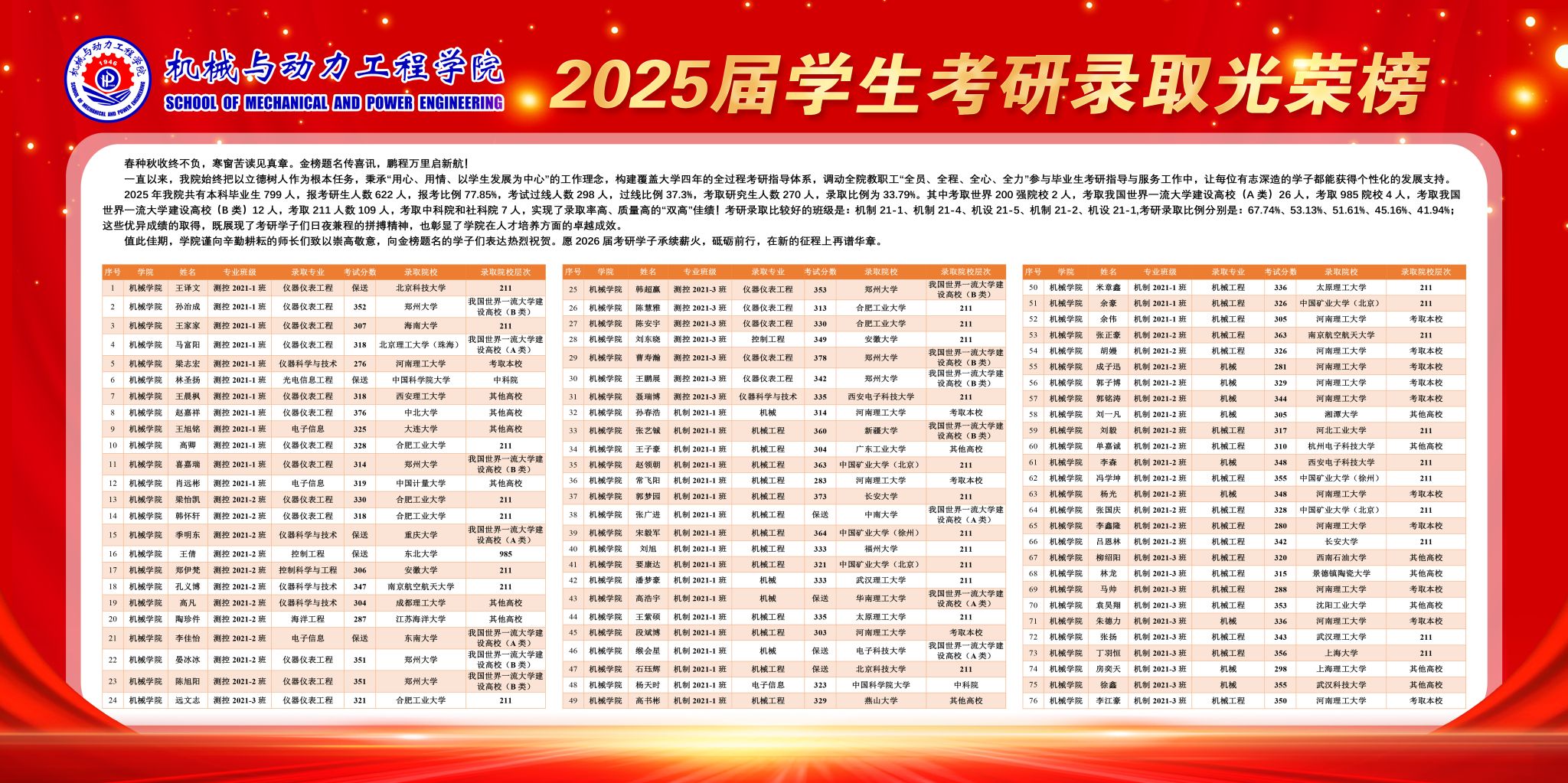 2025年我院共有本科毕业生799人,报考研生人数622人,报考比例77.85%,考试过线人数298人,过线比例37.3%,考取研究生人数270人,录取比例为33.79%。其中考取世界200强院校2人,考取我国世界一流大学建设高校(A类)26人,考取985院校4人,考取我国世界一流大学建设高校(B类)12人,考取211人数109人,考取中国科学院和中国社会科学院7人,实现了录取率高、质量高的“双高”佳绩!考研录取比较好的班级是:机制21-1、机制21-4、机设21-5、机制21-2、机设21-1,考研录取比例分别是:67.74%、53.13%、51.61%、45.16%、41.94%;这些优异成绩的取得,既展现了考研学子们日夜兼程的拼搏精神,也彰显了学院在人才培养方面的卓越成效。