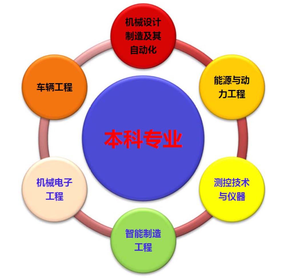 学院建有机械设计制造及其自动化(含机械设计、机械制造2个专业方向)、能源与动力工程、测控技术与仪器、车辆工程、机械电子工程、智能制造工程等6个本科专业,其中机械设计制造及其自动化和车辆工程按照机械大类招生。